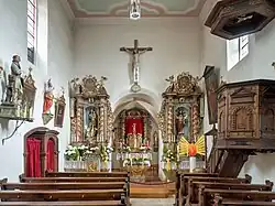 Die Pfarrkirche St. Bartholomäus ist bereits im Jahre 1362 belegt. Im Kern ist sie eine 1457 errichtete gotische Chorturmkirche mit barockem Langhaus. Sie steht am nördlichen Dorfrand und ist dem heiligen Bartholomäus geweiht.[5] Ihre Orgel stammt von Josef Wiedemann (1864).