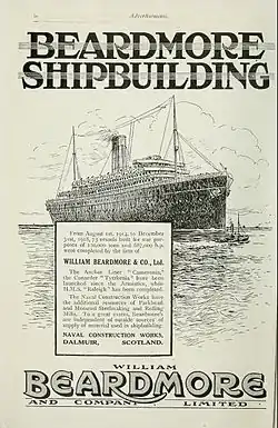 Der Gründer William Beardmore errichtete zunächst in Parkhead/Glasgow einen Betrieb, der sich im Besonderen mit der Herstellung von Stahlteilen für die Schiffsindustrie befasste, die Firma William Beardmore & Co. Am Bau des Riesenrad Blackpool war das Unternehmen beteiligt und stellte die Stahlachse für das Bauwerk her. Im Jahre 1899 erwarb Beardmore die Werft Robert Napier & Sons in Govan bei Glasgow. 1905 wurde eine weitere Werft eröffnet: die Naval Construction Works in Dalmuir bei Clydebank.[1]