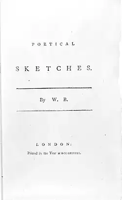 Nach seinem Studium an der Royal Academy of Arts fand Blake sein Auskommen durch Aufträge des radikalen Buchhändlers und Verlegers Joseph Johnson; die Hilfe von Freunden wie Flaxman ermöglichte Blake 1783 den Druck seines ersten Buches Poetical sketches, einer Sammlung von Gedichten und Prosawerken, die zwischen 1769 und 1777 entstanden waren.[25]