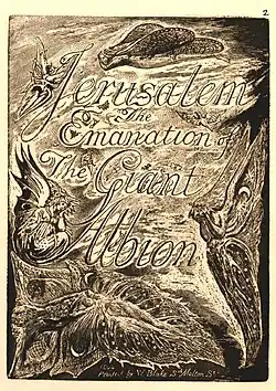 Zu den letzten bedeutenden Werken Blakes in der Form des illuminated printing zählen nach Vala or the Four Zoas (1795–1807) noch Milton (1809) und Jerusalem, The emanation of the giant Albion (1804–20), in denen er hebräische, germanische und keltische Mythen zu einer neuen Kosmologie zu verschmelzen versuchte. Während Milton den Abschluss und zugleich Höhepunkt der langjährigen Auseinandersetzung Blakes mit dem Werk Miltons darstellt und ähnliche kosmische Dimension wie Paradise lost öffnet, liefert Jerusalem Blakes letzte große Prophetie über den Fall des Giganten Albion und seiner Erweckung zum ewigen Leben.[33]