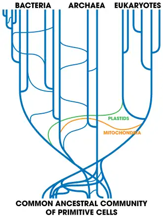 - ↑ Endosymbiose und Horizontaler Gentransfer (HGT) sind im Konzept der evolutionärer Bäume, die nur Verzweigungen kennen, nicht darstellbar. „Symbiogenetische“ Stammbäume berücksichtigen dagegen auch entwicklungsgeschichtliche Symbioseereignisse als Verschmelzungen; eine weitere Vernetzung wäre die Darstellungen von HGT.