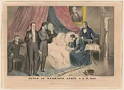 Am 26. März kehrte Harrison nass von einem Besuch bei Oberst John Tayloe, dem er einen Botschafterposten angeboten hatte,[188] in das Weiße Haus zurück, entwickelte Symptome einer schweren Erkältung sowie Lungenentzündung und erlitt einen Kollaps. Die Ärzte diagnostizierten am nächsten Tag eine Lungenentzündung, die jedoch „nicht gefährlich“ sei. Von da an wurde Harrison einer gründlichen medizinischen Behandlung unterzogen. Damals bedeutete das Aderlass und Schröpfen sowie Kuren mit Laudanum, Opium, Campher und Rizinusöl. Auch Brandy und Wein fehlten nicht als Medizin. Collins fragt in ihrer Biographie, ob möglicherweise nicht diese Pflege den Tod verursacht habe.[189] Am 3. April erklärten ihn vier Ärzte als nicht mehr zu retten. Kurz danach versank Harrison in ein Delirium und anschließenden Stupor. Am 4. April gegen 00:30 Uhr starb der Präsident im Alter von 68 Jahren.[190] Harrisons Präsidentschaft ist mit einer Dauer von einem Monat die kürzeste in der Geschichte der Vereinigten Staaten. Der erstmalige Tod eines amtierenden Präsidenten schockierte die Nation; teilweise wurde die Anteilnahme mit der Trauer nach Washingtons Tod verglichen. Der Leichnam wurde in der Rotunde des Kapitols in einem Sarg mit Sichtfenster aufgebahrt. Am 7. April brachte ein Trauerzug die Überreste Harrisons zum Friedhof des Kongresses. Sein Pferd Whitey trottete in der Prozession reiterlos mit, das traditionelle Symbol für einen gefallenen Führer. Insgesamt gab die Zeremonie die Blaupause für spätere Anlässe dieser Art wie die Beerdigung von Zachary Taylor oder Lincoln vor. Die immer noch in North Bend weilende Anna Harrison bereitete dort eine Begräbnisstätte, das heutige William Henry Harrison Tomb State Memorial,[191] für ihren Mann nahe dem Grab ihres Vaters vor. Im Jahr 1858 brannte das als log cabin in die Geschichte der Präsidentschaftswahlen eingegangene Harrison-Anwesen nieder.[192]