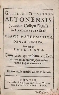 - 3. Auflage: Clavis mathematicae denvo limata, sive, Potius fabricata cum aliis quibusdam ejusdem commentationibus, quae in sequenti pagina recensentur. Oxford 1667 (Digitalisat).
