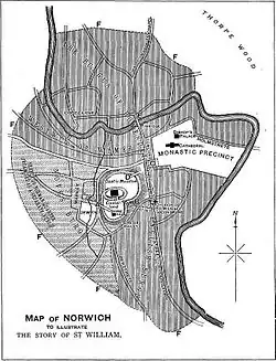 Dem Juden, in dessen Haus William angeblich gemartert worden war, gab er den Namen Deulesalt. So hieß ein jüdischer Bankier in Norwich, den ein verschuldeter christlicher Handwerker 1149 ermordet hatte, der ab 1150 dafür in London vor Gericht stand.[6] Während dieses Prozesses erweiterte Monmouth die Legende: Spaniens führende Juden träfen sich jährlich in Narbonne und losten aus, in welcher Stadt im laufenden Jahr ein Christenkind zu opfern sei, um den Judengemeinden weltweit Christenblut bereitzustellen. Im Jahr 1144 sei das Los auf Norwich gefallen. Jüdische Schriften verlangten dieses jährliche Opfer, weil die Juden nur so ihre Freiheit und verlorene Heimat wiederzuerlangen glaubten.[7] Williams Leichnam soll von den Tätern am darauffolgenden Karfreitag im Thorpe Wood, einem Wald bei Norwich, beseitigt worden sein. Nach der Entdeckung von Williams Leichnam am Karsamstag, soll der Verdacht auf die Juden der Stadt gefallen sein – Monmouth schreibt von einem „Traumgesicht“, das Williams Mutter erschienen sei.