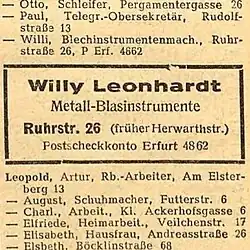 Am 21. September 1905 kehrte Leonhardt nach Erfurt zurück. Im folgenden Jahr heiratete er die in Büßleben geborene Minna Herzog und machte sich als Instrumentenmacher selbstständig. In den Erfurter Adressbüchern ist er bis zum Jahr 1950 verzeichnet. Seine Werkstatt für Metallblasinstrumente befand sich zuletzt an der Geschäftsadresse Ruhrstr. 26 (früher Herwarthstraße).[1]