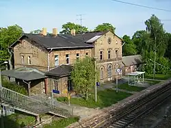 - Das Bahnhofsempfangsgebäude in Wilmersdorf wurde Anfang der 1860er-Jahre nach Entwürfen des Architekten Theodor August Stein in Ziegelbauweise errichtet, um den Ort an die Bahnstrecke zwischen Angermünde und Stralsund anzubinden. 1885 wurde der Bahnhof eingeweiht.[4] Das Empfangsgebäude ist ein 2 ½-geschossiger Bau mit Satteldach.