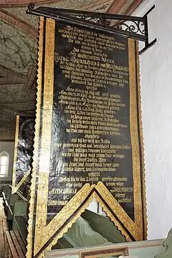 Trauerfahne aus Kupferblech mit lebensgroßem Abbild des Justus Bernhard von Wilmsdorff († 1711), Amtshauptmann auf Seehesten, in der Heilig-Kreuz-Kirche in Seehesten (Szestno).