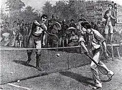 Die ersten Lawn Tennis Championships begannen am 9. Juli 1877 auf einem Gelände an der Worple Road in Wimbledon. Anlass dafür war die Rechnung über 10 Pfund für eine Rasenwalze, die erneuert werden musste. So entstand die Idee, ein Turnier abzuhalten und dafür Eintrittsgeld von den Zuschauern zu verlangen.[3][4]