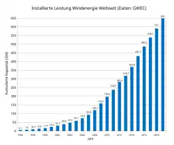 - ↑ Hannah Ritchie, Max Roser: Installed wind capacity. In: Our World in Data. 28. November 2020 (ourworldindata.org [abgerufen am 25. Oktober 2021]).