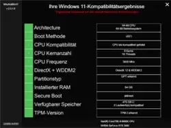 Microsoft bietet mit der HealthCheckApp ein Tool zur Integritätsprüfung vorhandener Hardware an.[23] Alternativen zum Microsoft-Programm sind z. B. das freie Open-Source-Projekt WhyNotWin11 von Robert C. Maehl[24] oder auch einfach eine Stapelverarbeitungsdatei wie W11CompChk.bat (für „Windows 11 Compatibility Check“)[25] von Benutzer JBCarreon123 auf dem (englischsprachigen) Internetforum „Windows 11 Forum“ (elevenforum.com, keine Verbindung mit Microsoft).[26] Mit WhyNotWin11 lässt sich auch von einem Windows-PE-basierten Live-Windows aus die Kompatibilität ermitteln, was mit der HealthCheckApp von Microsoft nicht geht.[27]
