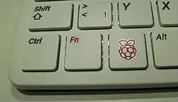 Auf der offiziellen Tastatur des Raspberry Pi ist eine Himbeere auf der „Supertaste“ abgebildet.