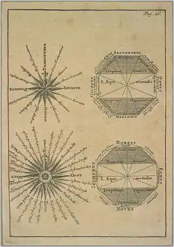 Windrosen sind meistens in 16 Himmelsrichtungen, also Nord (N), NNO, NO usw. unterteilt, aber die Teilung kann auch für bis zu 32 Richtungen gewählt sein.[1]