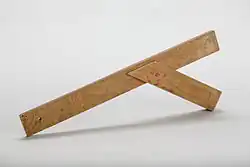 - Beim Anschlagwinkel ist einer der beiden Schenkel als Anschlag gestaltet, mit dem er an geraden Kanten angelegt werden kann. In der Holzbearbeitung verwendete Anschlagwinkel bestehen aus Holz, oft in Kombination mit messingbelegten Kanten, während der zweite Schenkel aus Stahl gefertigt ist.[1] Der in der Metallbearbeitung eingesetzte Anschlagwinkel besteht üblicherweise ganz aus Werkzeugstahl.