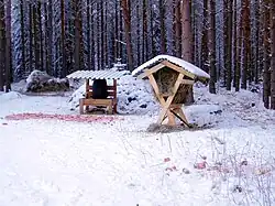Futterstellen werden so angelegt, dass Schalenwild (z. B. Rehe) nicht durch harschen Schnee laufen muss, um sich nicht zu verletzen.