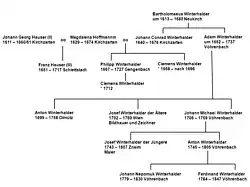 - Josef Winterhalder der Jüngere (Josef Winterhalder II; * 1743 in Vöhrenbach, † 1807 in Znaim), Sohn des Johann Michael.[12] Zunächst Lehrling beim Vater, zog er, nachdem seine Mutter 1/49 gestorben war, 1753 mit seinem Bruder Anton und seiner Schwester Theresia zu seinem Onkel Josef Winterhalder dem Älteren in Znaim oder Olmütz, der die Kinder adoptierte.