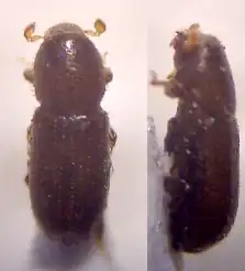 Die schwarzbraun gefärbten Käfer werden ein bis 1,2 Millimeter lang und haben einen walzenförmigen Körper. Der Halsschild verdeckt von oben gesehen den Kopf und ist ausschließlich punktiert, das heißt ohne Höcker und Schuppen. Die matten Flügeldecken weisen feine Schuppen auf. Die Fühler und Beine sind hellbraun, die Fühlergeißel ist zweigliedrig und die Fühlerkeule hat eine angedeutete Naht. Sie ist unregelmäßig und breit eiförmig.