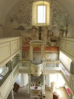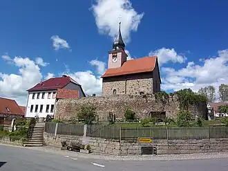 Sehenswert ist die Wehrkirche des Dorfes, die aus dem 12. Jahrhundert stammt und teils noch romanische Züge trägt. Sie steht auf einem Hügel in der Ortsmitte und ist von einer drei Meter hohen Mauer umgeben. Am 25. Juli 1685 spielte Heinrich Bach auf der Orgel der Kirche. In der Kirche befindet sich auch eine seltene, lebensgroße Wandmalerei von „Adam und Eva im Paradies“. Des Weiteren gibt es in der Kirche ein Taufbecken von 1596 und eine Glocke von 1682. Nach dreijähriger Sanierung konnte die Kirche 2004 wieder eingeweiht werden. Sie untersteht dem Kirchspiel Neuroda und ist evangelisch[6].