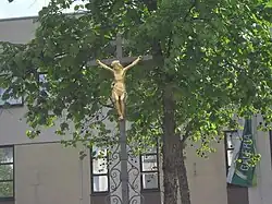 Das schmiedeeiserne Kreuz, 4,50 m hoch und 1,00 m breit, wurde am 10. Dezember 1708 errichtet. Auf einem Eisenpfahl befindet sich ein vergoldeter Christuskorpus. Am Pfahl ist geschmiedetes Rankenwerk angebracht. In der Mitte des Pfahls ist eine Inschriftentafel mit folgendem Text angebracht: Effigiem Christi, cum transis, semper honora - non tamen effigiem, sed quem designat adora. (Wenn du vorübergehst, bezeuge dem Abbild Christi Ehre - doch bete nicht das Abbild an, sondern denjenigen, den es darstellt).