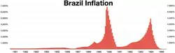 Ab 1974 endete das „Wunder“ mit dem Ölpreisschock: Brasilien hatte sich hoch verschuldet, und in den 1980er Jahren schlitterte es in eine Schuldenkrise. Die 1980er gelten als Brasiliens „verlorenes Jahrzehnt“: Das Wachstum stagnierte, und die Inflation geriet außer Kontrolle. Die jährliche Inflationsrate lag teils im dreistelligen Bereich und steigerte sich bis Anfang der 1990er zur Hyperinflation.[11] Regierungen versuchten mit mehreren Währungsreformen und Lohn- und Preisstopps gegenzusteuern, jedoch ohne dauerhaften Erfolg. Erst 1994 gelang mit dem Plano Real der Durchbruch: Die Einführung der neuen Währung Real und strikte Ausgabendisziplin brachten die Inflation zum ersten Mal nachhaltig unter Kontrolle.[7]