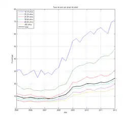 Die Arbeitslosigkeit in Spanien ist Anfang 2015 mit 23,7 % die zweithöchste innerhalb der Europäischen Union.[55] Laut Angaben des Statistischen Landesamtes EPA (Encuesta de Población Activa) sind im ausgehenden Jahr 2014 rund 5,5 Mio. Personen als erwerbslos gemeldet.[56] Als erwerbslos kann eine Person zwischen dem 16. und 65. Lebensjahr gelten. Der internationale Währungsfonds IWF beobachtet eine fortschreitende Ungleichheit zwischen den Generationen. Während die ältere Generation noch in den Genuss unbefristeter und hoch dotierter Arbeitsverträge gekommen ist, gelingt es der jüngeren Generation kaum noch, eine unbefristete und gut bezahlte Beschäftigung zu erlangen.