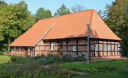 Eine alte Durchfahrtscheune steht südwestlich, eine öffentliche Toilette nordwestlich, die Skulptur Der Wächter auf dem Vorplatz und eine alte Holzpumpe im südöstlichen Bereich des Gebäudes.[3]