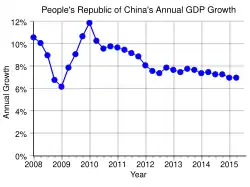 In den letzten Jahren wird daran gearbeitet die Abhängigkeit der Wirtschaft der Volksrepublik vom Außenhandel zu verringern.[22] So hat sich die Abhängigkeit der chinesischen Volkswirtschaft vom Außenhandel im Jahr 2012 um 3,1 Prozentpunkte auf 48 Prozent verringert. Im Jahr 2006 lag die Abhängigkeit von den Ausfuhren auf einem Rekordniveau von 67 Prozent. Seither sind die Zahlen rückläufig. Der Außenhandel spielt zwar immer noch eine bedeutende Rolle, aber der BIP-Zuwachs wird immer mehr von der inneren Nachfrage angetrieben.[32]