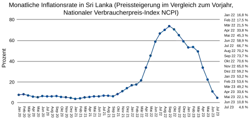 Die Inflationsrate im Vergleich zum Vorjahresmonat stieg bis auf ein Maximum von 73,7 % im September 2022 an und fiel danach wieder ab. Die Zentralbank Sri Lankas erwartete im Januar 2023 einen Rückgang bis zum Jahresende 2023 auf unter 10 Prozent.[35] Tatsächlich lag die Inflationsrate schon im Juli 2023 bei unter 5 %. Die Abnahme des Bruttoinlandsprodukts im Jahr 2022 wurde auf 8 Prozent geschätzt. Die Zentralbank rechnete mit einer Erholung ab der zweiten Jahreshälfte 2023.[36]