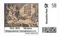 Zum hundertsten Jahrestag der Gründung des Wittgensteiner Heimatvereins, besser seines Vorgängervereins, sind vier Briefmarken entstanden. Die selbstklebenden Briefmarken (Marke Individuell der Deutschen Post) haben die Nennwerte 45 Cent und 58 Euro-Cent. Sie sind 33 mm × 55 mm groß und es wurden jeweils zwanzig Exemplare auf einem DIN-A4-Bogen gedruckt. Die erste Marke entstand kurz vor Weihnachten 2012. Die Auflage dieser Marke betrug 40 Exemplare, der Nennwert 45 Cent. Das Motiv zeigt die Titelseite des ersten Heftes der Mitteilungen des Vereins für Geschichte und Volkskunde Wittgensteins aus dem Jahr 1913, die von dem aus Berleburg stammenden Kunstmaler und Grafiker Richard Winckel gezeichnet worden war.[3]