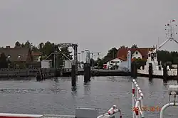 An der Wittower Fähre überquert eine 110-kV-Freileitung zum Umspannwerk Bohlendorf auf zwei je 95 Meter hohen Masten die Engstelle mit einer Spannweite von 840 Metern.