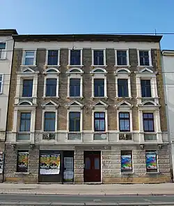 Das direkt an der Hauptstraße gelegene viergeschossige Haus entstand 1891. Bis zur Eingemeindung Fermerslebens nach Magdeburg im Jahr 1910 hatte das Gebäude die Adresse Schönebecker Straße 35. Der aus Ziegeln errichtete Bau verfügt über eine repräsentativ gegliederte sechsachsige Fassade im Stil der Neorenaissance, die als palazzoartig beschrieben wird.[1] Das Erdgeschoss ist rustiziert, die seitlichen Fensterachsen verfügen über eine Ädikularahmung. Die Fenster im ersten Obergeschoss verfügen über dreieckige Fensterverdachungen. Im zweiten Obergeschoss sind diese Verdachungen als Segmentbögen gestaltet.