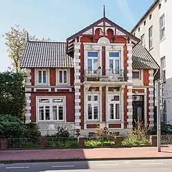 Das zweigeschossige traufständige historisierende verklinkerte Gebäude auf einem Kellersockel, mit Satteldach, Giebelrisalit mit Schwebegiebel, Giebelspieß, Balkon und gusseisernem Gitter, rechteckigen gerahmten Öffnungen sowie markanter Quaderung der Ecken stammt vom Ende des 19. Jahrhunderts. 1919 erwarb der Unternehmer (Viehtransport sowie Auktions- und Bankhaus) Heinrich Meyer das Haus und erweiterte bzw. veränderte seine Unternehmensbereiche (Baulandbeschaffung, Verpachtung, Verkauf und Dienstleistungen im Immobilienbereich). Die Firma Meyer & Wettermann verlegte 2009 ihren Hauptsitz.[1]