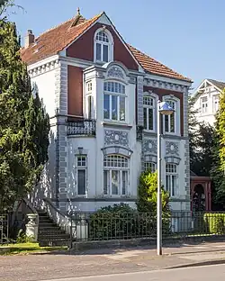 Das zweigeschossige villenartige traufständige verputzte (EG) und verklinkerte (OG) Gebäude auf Sockel mit Jugendstilelementen, mit Sattel- und Walmdach, dem linken Giebelrisalit mit dem zweigeschossigen Erker und zwei seitlichen Balkonen sowie einer linken Freitreppe und einem späteren eingeschossigen Anbau, den segmentbogigen Fenstern sowie Rahmung der OG-Fenster den dekorativen Brüstungsfeldern, den geschossteielnden und dem Traufgesimsen mit angedeuteten Balkenköpfen und den Quadern an den Ecken, wurde um 1900 gebaut.[1]