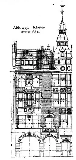 - ↑ Architekten- und Ingenieur-Verein zu Düsseldorf (Hrsg.): Düsseldorf und seine Bauten. L. Schwann, Düsseldorf 1904, Beschreibung auf S. 333 und S. 334, S. 336. [Abb. 435. Klosterstrasse 68a. Ansicht]