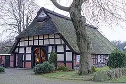 Das eingeschossige traufständige Wohn- und Wirtschaftsgebäude, ein Zweiständer-Hallenhaus in Fachwerk und Unterrähmkonstruktion mit Stein- und Lehmausfachungen, mit reetgedecktem Krüppelwalmdach und Niedersachsengiebel mit Uhlenloch und der Grooten Door mit Korbbogen, stammt aus der zweiten Hälfte des 17. Jahrhunderts. Es ist eines der älteren Hallenhäuser des Landkreises und wurde saniert und zum Wohnhaus umgebaut.[1]