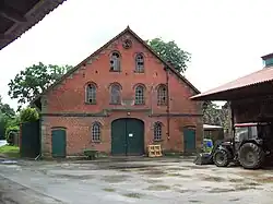 Das eingeschossige traufständige Gebäude wurde 1903 hallenhausartig in Backstein mit Drempel, ziegelgedecktem Satteldach und Grooter Door mit Segmentbogen gebaut. Es wurde mit Rund- und Segmentbogenfenstern in Putzeinfassungen, Rundfenstern an den Giebeln, Gurt- und Ortganggesimsen und Eckquaderung gestaltet.[1]