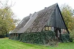 Das eingeschossige giebelständige Gebäude als Zweiständer-Hallenhaus in Fachwerk mit Lehm- und Steinausfachungen, Satteldach und Grooter Door mit Korbbogen sowie regionaltypischer senkrechter Verbretterung in den Giebeldreiecken wurde 1802 (Inschrift) gebaut.[1]