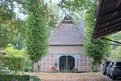 Das eingeschossige giebelständige Zweiständer-Hallenhaus in Fachwerk mit Steinausfachungen, reetgedecktem Krüppelwalmdach, Niedersachsengiebel mit Uhlenloch, Pferdeköpfen und Grooter Door mit Korbbogen, wurde 1740 (Inschrift) gebaut unter Wiederverwendung von Gefügeteilen des 16. Jahrhunderts.[1]