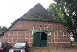 Das eingeschossige traufständige Zweiständer-Hallenhaus in Fachwerk mit Steinausfachungen, Krüppelwalmdach und Grooter Door mit Korbbogen wurde versetzt und 1861 für Johann Hinrich Frick (Inschrift) neu aufgebaut. Das Haus wurde um 1930 zum Gasthaus mit Saal- und Dachausbau mit Schleppgaube umgebaut.[1] Auch das alte Pflaster vom Hof blieb erhalten.