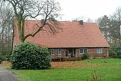 Das eingeschossige traufständige Gebäude als Zweiständer-Hallenhaus in gleichmäßigem Fachwerk mit Steinausfachungen, ziegelgedecktem Satteldach, Uhlenloch, Ladeluke, senkrechter Verbretterung in den Giebeldreiecken und später verglaster Grooter Door mit Korbbogen, wurde nach 1823 im 19. Jahrhundert an einem Stichweg gebaut.[1] 2010 richteten Eva Janschek und Jens Schröter aus Hamburg kommend hier die Kleine Galerie im Moor ein. Sie sind verbunden mit den Künstlern Ole West und Gerd Rehpenning.