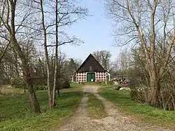 Das eingeschossige giebelständige zurückstehende Gebäude als Zweiständer-Hallenhaus in Fachwerk mit Steinausfachungen, Satteldach mit senkrechter Verkleidung im Giebeldreieck, Ladeluke und Grooter Door mit geradem Abschluss wurde im 19. Jahrhundert gebaut.[1]