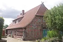 Das eingeschossige giebelständige Hallenhaus in Fachwerk mit Steinausfachungen sowie Krüppelwalmdach, Niedersachsengiebel mit Uhlenloch und niedersächsischen Pferdeköpfen wurde 1818 (Inschrift über der Grooten Door) gebaut.