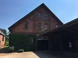 Das eingeschossige traufständige Gebäude als Hallenhaus in Backstein mit ziegelgedecktem Satteldach und Grooter Door mit Segmentbogen, wurde laut Inschrifttafel am Westgiebel 1919 gebaut. Der Wirtschaftsgiebel wurde aufwändig mit Putz- und Backsteingliederungen als Trauf-, Gurtgesims, Rahmungen der rundbogigen Fenster und Lisenen gestaltet.[1]