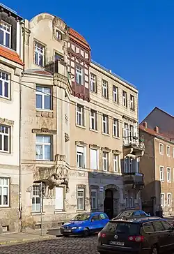 Das Gebäude wurde als viergeschossiges Wohnhaus innerhalb einer geschlossenen, heute teilweise kriegszerstörten Bebauung errichtet. Es zeichnet sich durch eine „reiche, originelle Bauornamentik“[1] aus. So wurden zwei Fledermäuse als Bildrelief in Sandstein eingearbeitet. Bemerkenswert ist die unterschiedlich gestaltete und in sich asymmetrische, neuen Achsen breite Fassade, ausgeführt bei gleichbleibender Sockelbildung, Geschoss- und Traufhöhe. Das ausgebaute Dachgeschoss zeigt eine Verblendung, die teilweise als Sandstein-Putzfassade, teilweise in Fachwerk ausgeführt worden ist. Unterschiedlich geformte und gestaltete Balkongitter schmücken das Haus.