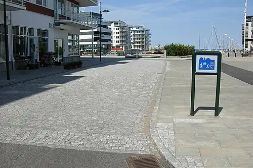 In verkehrsberuhigten Bereichen können Parkflächen mittels andersfarbiger Pflasterung markiert sein.[6]