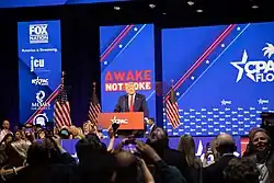 In den USA verknüpfen Konservative Woke-Sein mit Antiamerikanismus und Sozialismus. Entsprechende Feindbildkonstruktionen dienen im angloamerikanischen Raum auch dazu, Gesetze zu verabschieden, die die hegemonialen Machtstrukturen erhalten sollen, etwa Kriminalisierung von Protesten oder Verbot von Critical Race Theory an Schulen.[18][13] Beispielsweise kündigte der konservative Gouverneur Ron DeSantis 2022 den Stop W.O.K.E. Act an, der nach Aussage des Gesetzes „Arbeitnehmern, Unternehmen, Kindern und Familien Instrumente an die Hand [gibt], mit denen sie sich gegen die ‚woke‘ Indoktrination wehren können“.[13] Auch Donald Trump nutzte den Begriff und behauptete, Biden wolle Amerika „mit woke zerstören“.[22] Im deutschen Sprachraum werden zusammengesetzte Begriffe wie Woke-Angriff, Woke-Irrsinn oder Woke-Culture auf abwertende Weise genutzt, zum Beispiel von der Bild-Zeitung.[23] Ebenso agieren CDU/CSU seit der verlorenen Bundestagswahl 2021 gegen Wokeness, beklagen Einschränkungen von Freiheitsrechten und eine Bedrohung des „kulturellen Erbes“.[24] Markus Söder sagte beispielsweise beim Politischen Aschermittwoch 2023, dass die Bundesregierung ein „anderes Deutschland“ wolle und ihr Leitmotiv Wokeness sei.[25] Das im Mai 2023 verabschiedete Grundsatzprogramm der CSU enthält einen Satz zum Eintreten gegen den „Kulturkampf in Form von Identitätspolitik, Wokeness und Cancel Culture“.[26] Der Journalist Hannes Soltau verwies 2021 im Tagesspiegel darauf, dass „woke“ als Selbstbeschreibung im deutschen Diskurs kaum vorkomme, das Wort als „Signalwort des reaktionären Backlashs jedoch omnipräsent“ sei.[27] In Frankreich warnten 2021 Teile der Regierung um Emmanuel Macron und verschiedene französische Intellektuelle vor einer „außer Kontrolle geratenen woken Linken“ insbesondere an französischen Universitäten und verweisen auf deren Theorien zu Race, Gender und Postkolonialismus und der damit verbundenen Identitätspolitik.[28][29] Auch in Israel behauptet die Likud-Partei, die Zivilisation sei durch den „Wokismus“ der Linken gefährdet.[30]