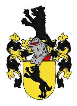 - Sohn Eberhard Freiherr Wolff von und zu Todenwarth (20. Juli 1614 in Aachen – 11. Juli 1663 in Regensburg), Darmstädtischer Geheimrat, Stiftshofrat in Regensburg, kaiserlicher Reichshofrat. Heirat 1636 in den Uradel Schenck zu Schweinsberg (Dorothea Elisabeth * 5. November 1619, † 1654). Gestorben in Regensburg auf der wegen Krankheit erfolgten Rückreise von Wien nach Darmstadt. Begraben in Regensburg am 16. Juli 1663 auf dem sog. Gesandtenfriedhof, bei der Dreieinigkeitskirche[8] Grabstein erhalten; Inschrift bekannt.[9]