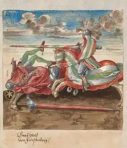 - ↑ Stefan Krause: Das Turnierbuch Freydal Kaiser Maximilians I. In: Sabine Haag u. a. (Hrsg.): Kaiser Maximilian I. Der letzte Ritter und das höfische Turnier. Ausstellungskatalog Mannheim 2014, Schnell und Steiner, Regensburg 2014, S. 166–180, hier S. 166 und S. 169.