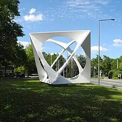 - Gesprengter Würfel (2018), Aluminium, weiß lackiert, Skulpturenpark vor dem Kunsthaus Rehau, Eugen-Gomringer-Platz 1, Rehau
