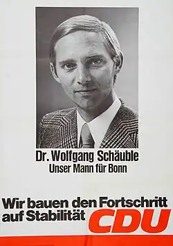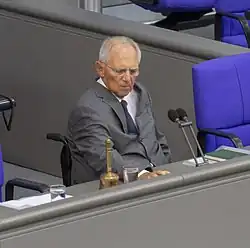 Wolfgang Schäuble (* 18. September 1942 in Freiburg im Breisgau; † 26. Dezember 2023 in Offenburg) war ein deutscher Politiker (CDU). Von 1984 bis 1989 war Schäuble Bundesminister für besondere Aufgaben und Chef des Bundeskanzleramtes (Kabinett Kohl II und Kabinett Kohl III), von 1989 bis 1991 Bundesminister des Innern (Kabinett Kohl III), von 1991 bis 2000 Fraktionsvorsitzender der CDU/CSU-Fraktion im Deutschen Bundestag und von 1998 bis 2000 auch CDU-Parteivorsitzender. Am 16. Februar 2000 erklärte Schäuble aufgrund seiner Verwicklungen in die CDU-Spendenaffäre seinen Rücktritt als Partei- und Fraktionsvorsitzender. 2005 wurde er erneut Innenminister im Kabinett Merkel I, 2009 bis 2017 Finanzminister im Kabinett Merkel II und III. Von 2017 bis 2021 war er der Präsident des 19. Deutschen Bundestags und eröffnete anschließend als Alterspräsident des 20. Deutschen Bundestags dessen konstituierende Sitzung.