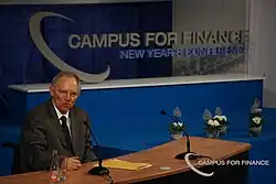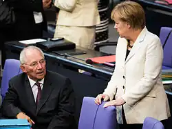 Im November 2009 verglich Schäuble das Ausmaß der Folgen der Finanzkrise ab 2007 mit dem Fall der Berliner Mauer.[86] Im Rahmen der Eurokrise und im Zuge der Einrichtung des europäischen Rettungsschirmes und dessen Mechanismus sträubte sich Schäuble als Finanzminister seit 2010 gegen die Forderungen vieler Bundestagsabgeordneter, jede einzelne Finanzhilfe an insolvenzgefährdete EU-Staaten vom Parlament bestätigt bekommen zu müssen (Haushaltsrecht). Die Kritiker sehen darin eine Verletzung des Demokratieprinzips.[87]